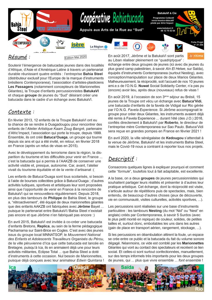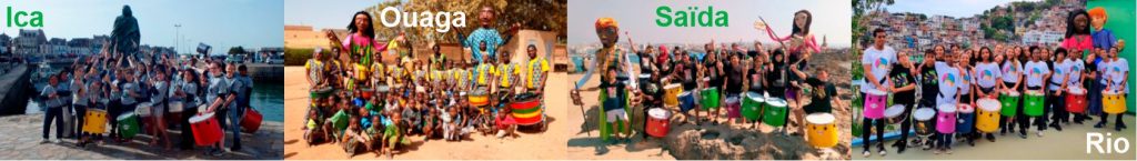 BatukaVI et la ″Coopérative″ Bahiatucada avec Bahia Steel/Contemporanea et Les Passagers, contribuent à l’éclosion de Batucadas, accompagnée de Marionnettes très Géantes, chez des partenaires d’Afric’Impact et de la BatukaVI … en Afrique, en Asie, en Amérique Latine (Noire et Indienne). Divers appuis/partages ont été lancés et se développent depuis quelques années dans des pays comme le Brésil, le Liban le Burkina Faso ou le Pérou, donc. On en parle ?